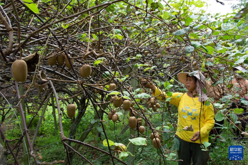 9月20日、湖南省永州市藍山県の舜源村でキウイを収穫する農家の人。(永州=新華社記者/柳王敏)