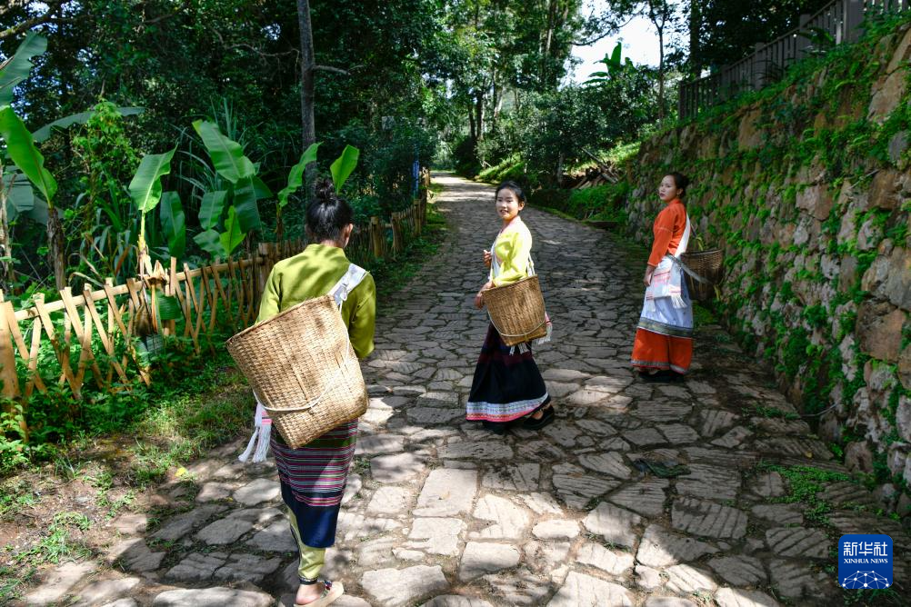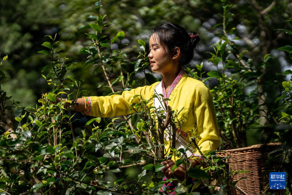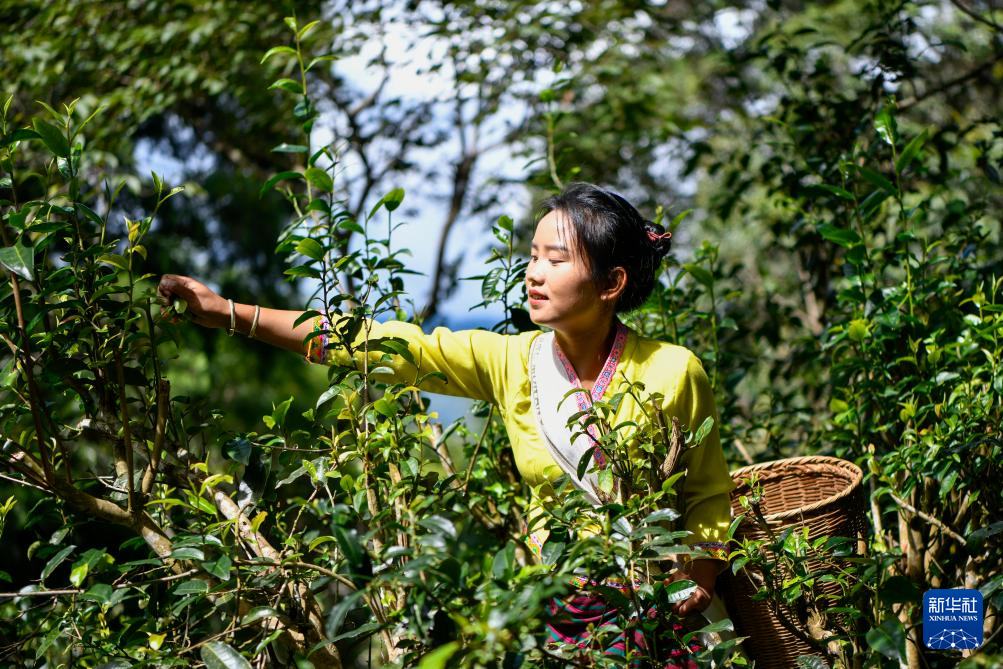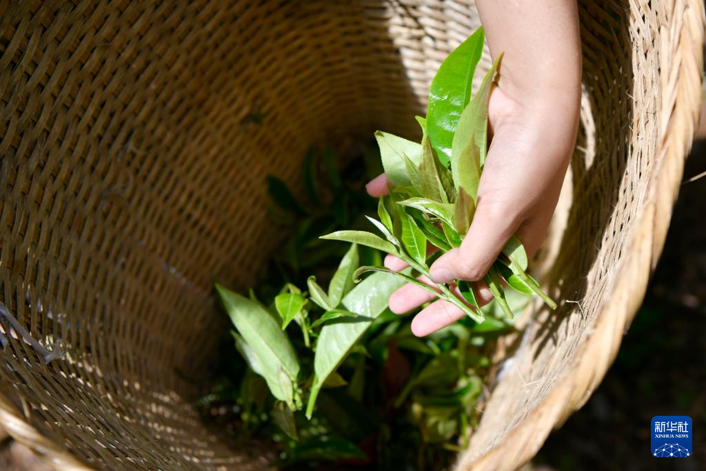 9月19日、摘み取った茶葉を竹籠に入れる景邁山翁基古寨の農家の人。(普洱=新華社記者/胡超)
