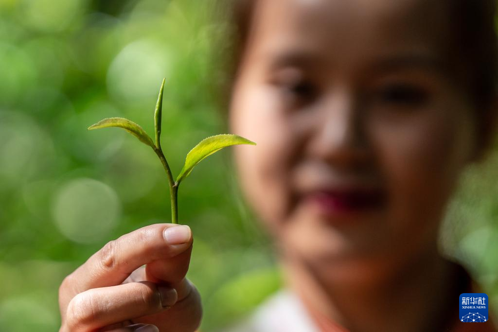 9月19日、摘み取った茶葉を見せる景邁山翁基古寨の農家の人。(普洱=新華社記者/胡超)