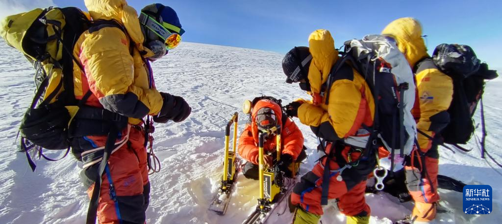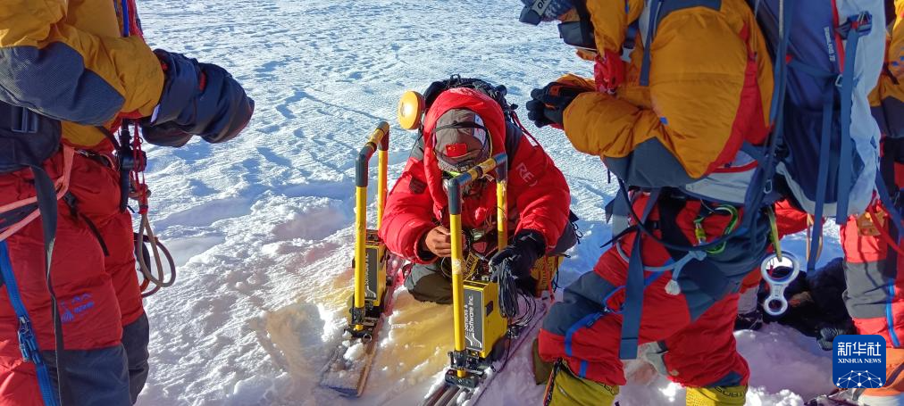 1日、レーダー厚さ計を使い、チョ・オユー山頂の雪氷厚を測定する科学調査隊員。(ラサ=新華社配信)