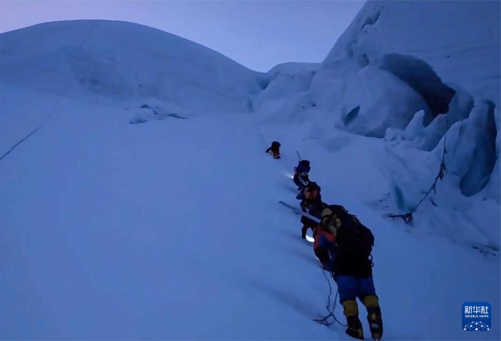 1日、登頂中の科学調査隊員。(ラサ=新華社配信)