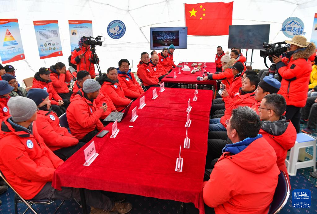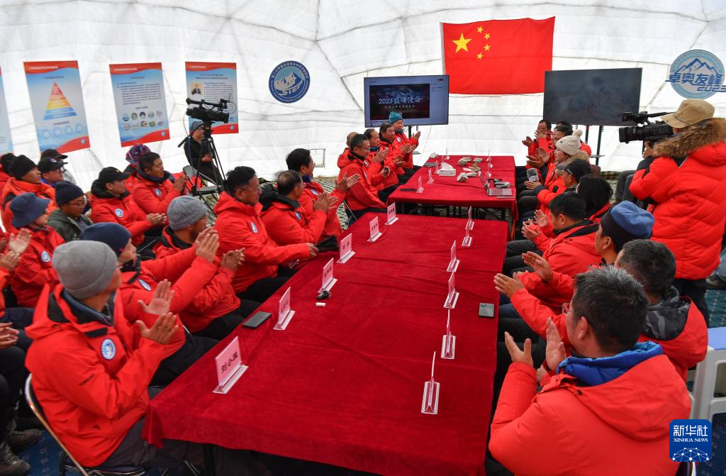 1日、標高約4950メートル地点のチョ・オユー科学調査ベースキャンプで、山頂での調査終了を発表する第2次青蔵高原総合科学調査研究隊チョ・オユー峰科学調査の安宝晟(あん・ほうせい)現場総指揮(奥テーブル着席左列手前)。(ラサ=新華社記者/晋美多吉)