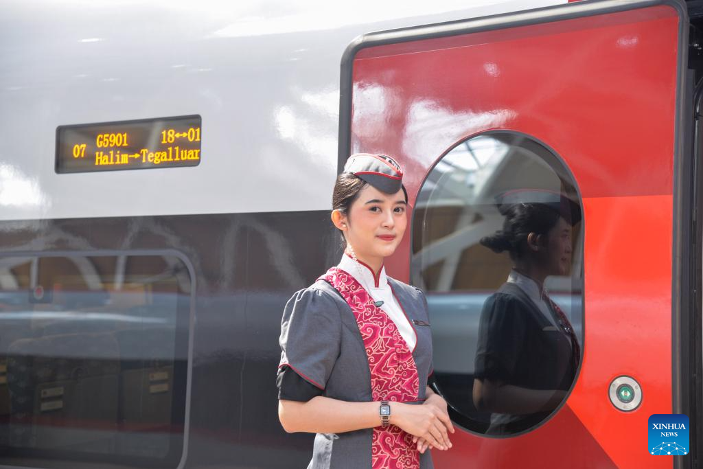 2日、ジャカルタのハリム駅に停車するジャカルタ・バンドン高速鉄道の列車。(ジャカルタ=新華社記者/徐欽)