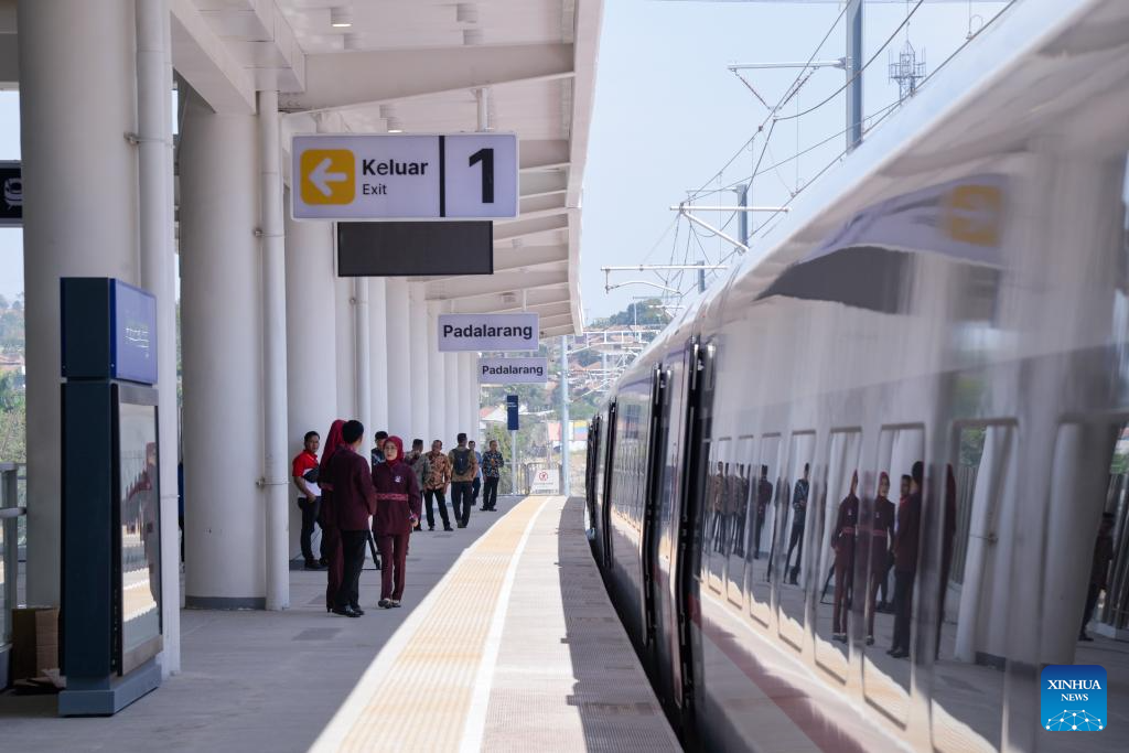 2日、インドネシア西ジャワ州のパダララン駅に停車するジャカルタ・バンドン高速鉄道の列車。(ジャカルタ=新華社記者/徐欽)pagebreak