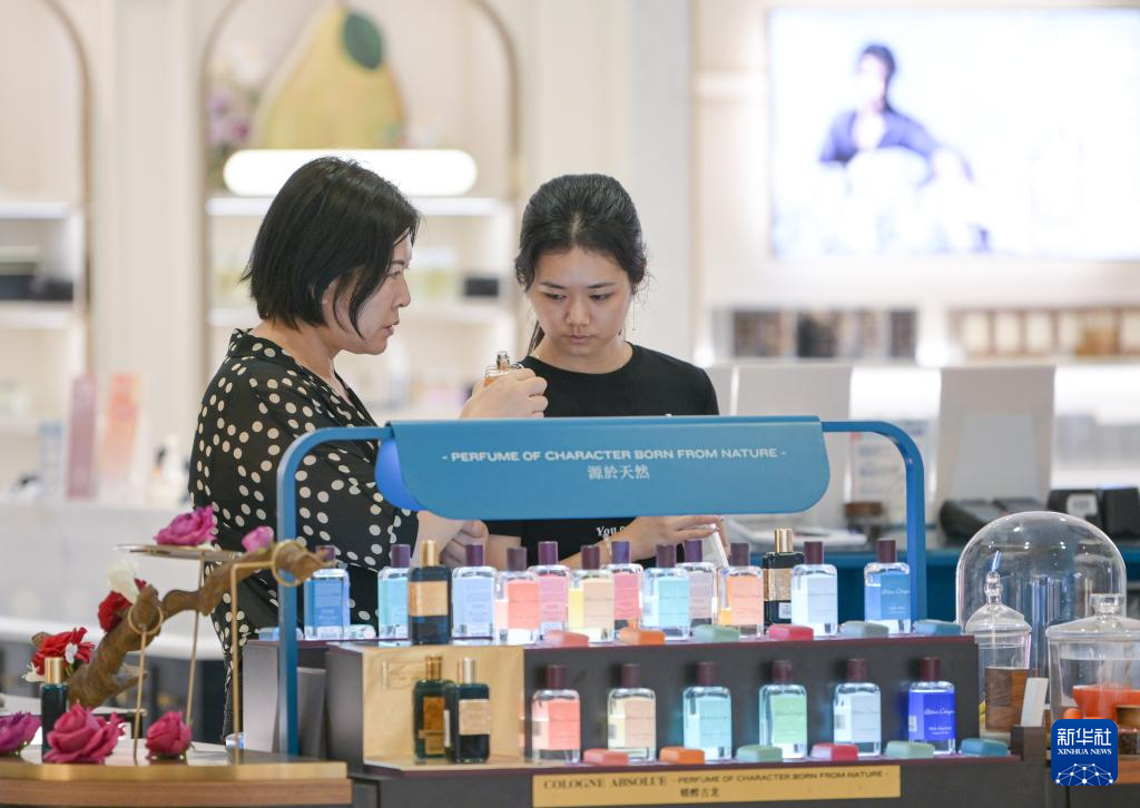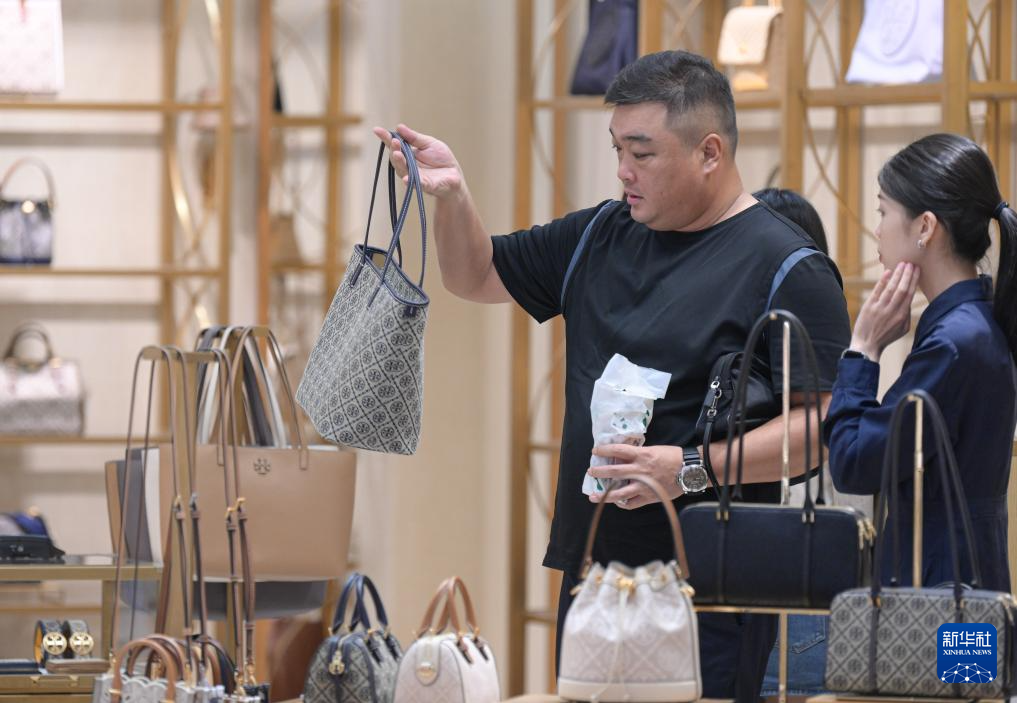 9月29日、中国免税品(集団)が運営する海口日月広場免税店で商品を選ぶ消費者。(海口=新華社記者/蒲暁旭)
