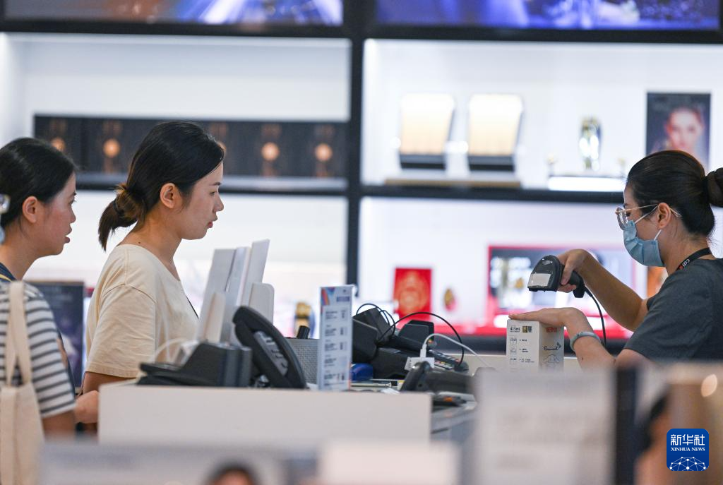 9月29日、中国免税品(集団)が運営する海口日月広場免税店で商品を購入する消費者。(海口=新華社記者/蒲暁旭)