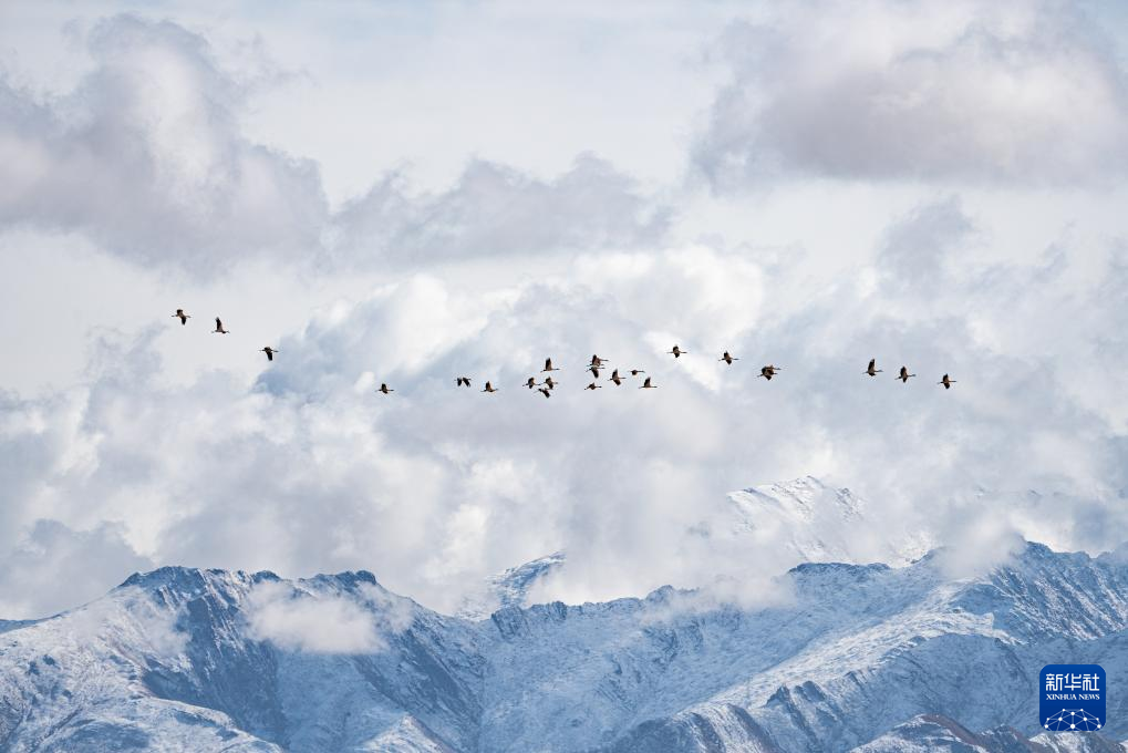 8日、ラサ市林周(ルンドゥプ)県の雪山とオグロヅル。(ラサ=新華社記者/晋美多吉)pagebreak