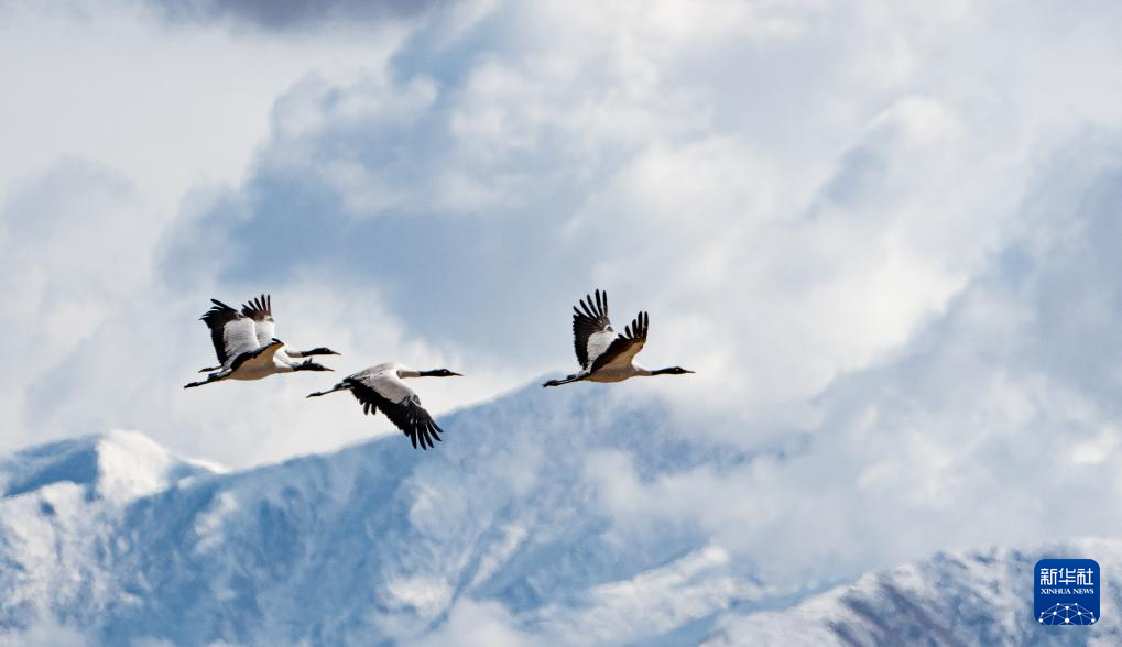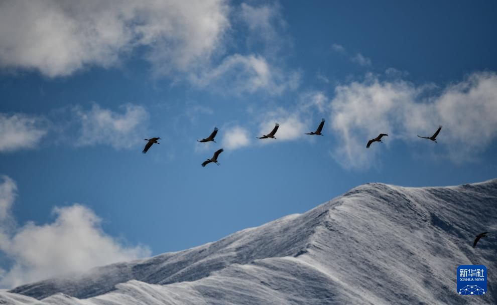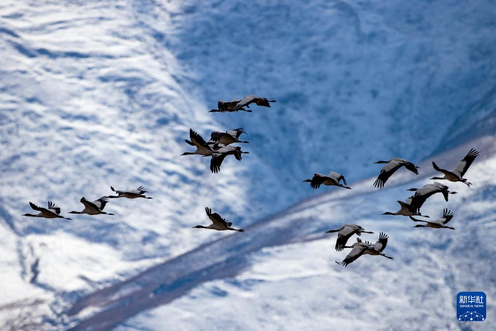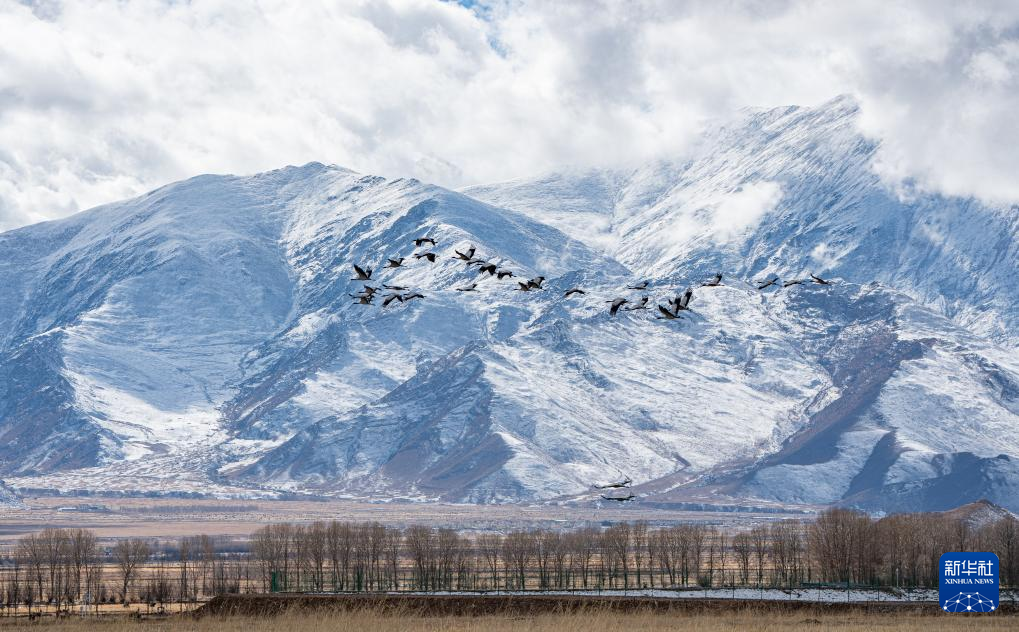 8日、ラサ市林周(ルンドゥプ)県の雪山とオグロヅル。(ラサ=新華社配信/丁増尼達)