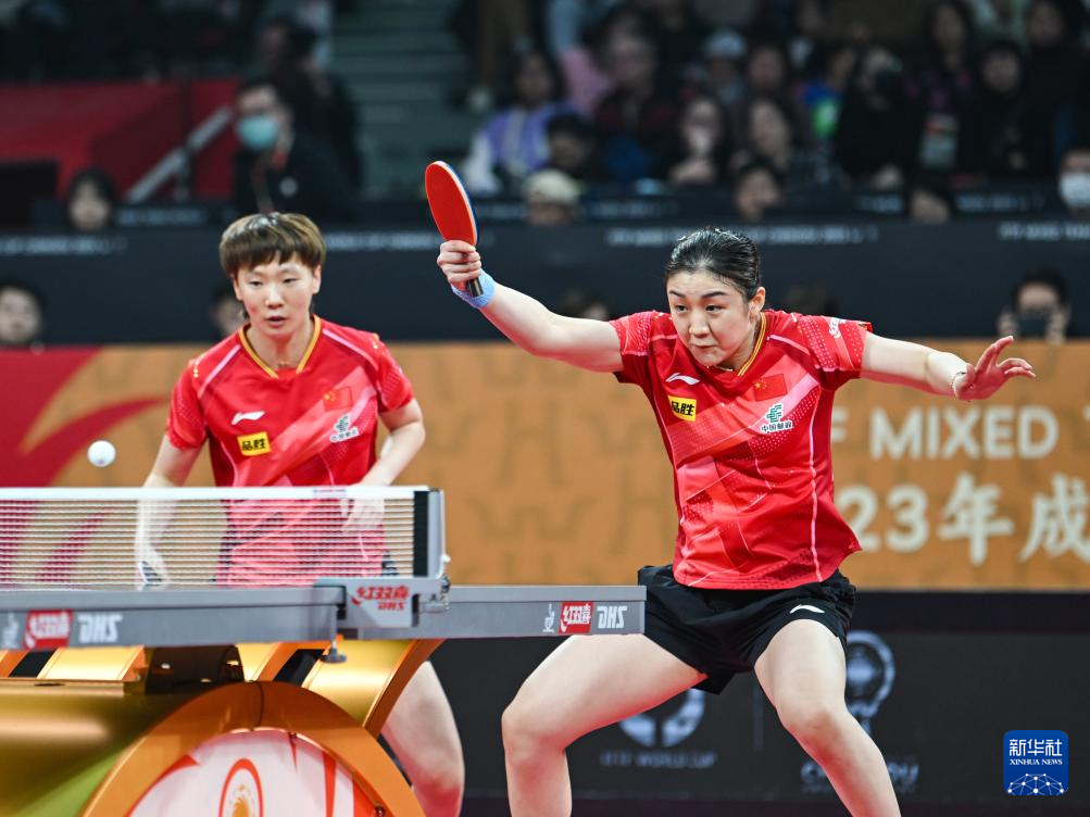 9日、女子ダブルスに臨む中国の王曼昱(おう・ばんいく、左)、陳夢(ちん・む)組。日本の木原美悠、張本美和組を2-1で下した。(成都=新華社記者/王曦)