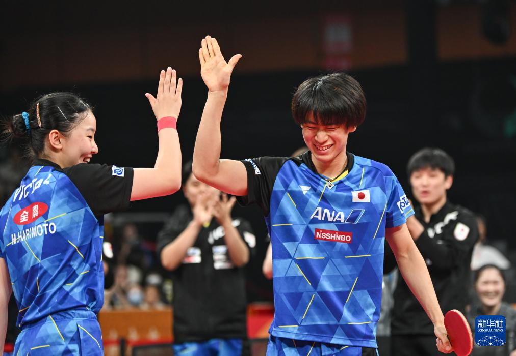 9日、混合ダブルスでの勝利を喜ぶ日本の戸上隼輔(右)、張本美和組。中国の王楚欽、孫穎莎(そん・えいさ)組を2-1で下した。(成都=新華社記者/王曦)
