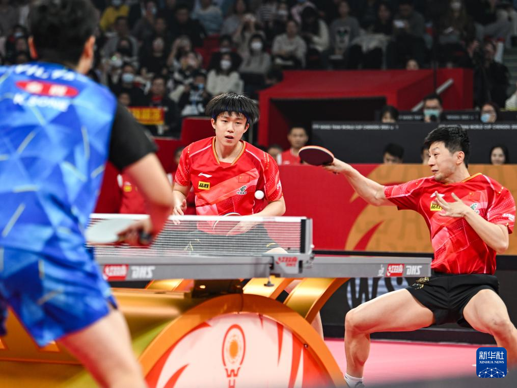 9日、男子ダブルスに臨む中国の馬竜(ば・りゅう、右)、王楚欽(おう・そきん)組。日本の戸上隼輔、曽根翔組を1-0で下した。(成都=新華社記者/王曦)