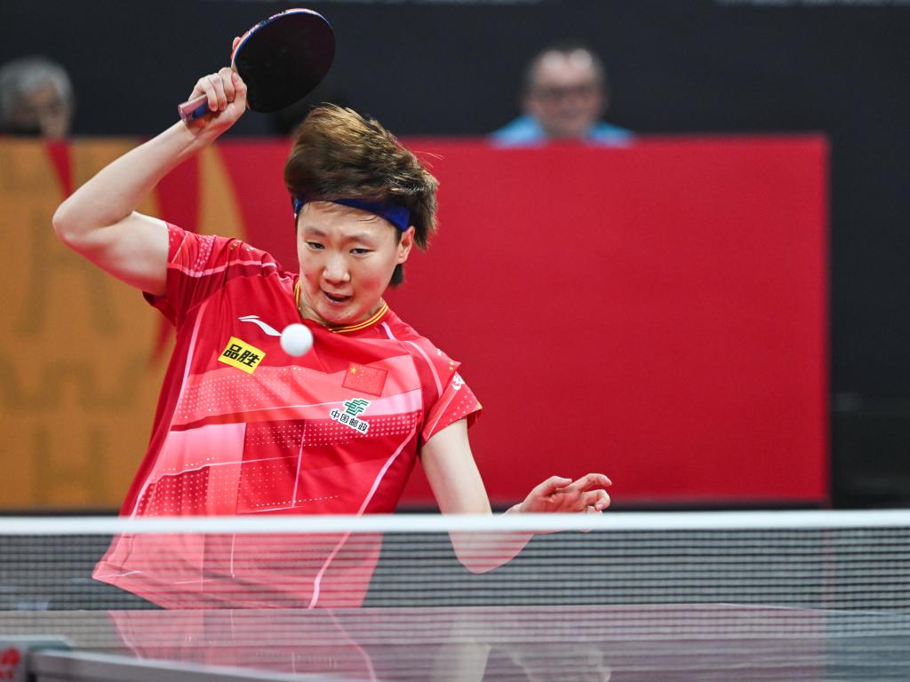 9日、女子シングルスでリターンする中国の王曼昱。日本の早田ひなを3-0で下した。(成都=新華社記者/王曦)