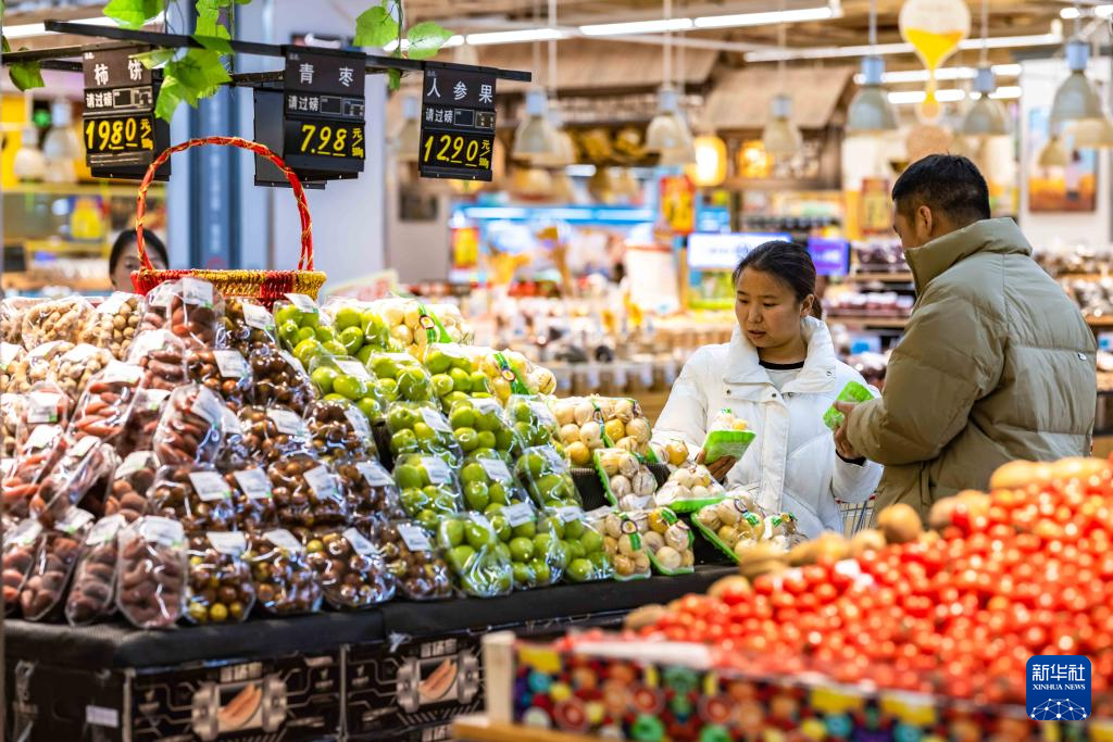 9日、貴州省安順市西秀区のスーパーで果物を選ぶ買い物客。(安順=新華社配信/陳熙)