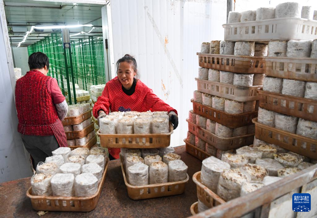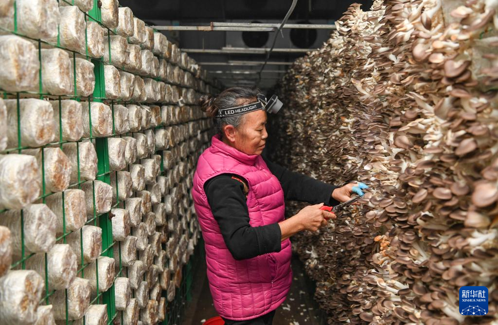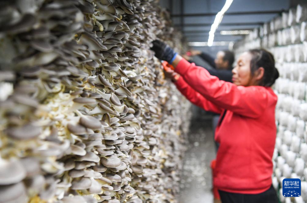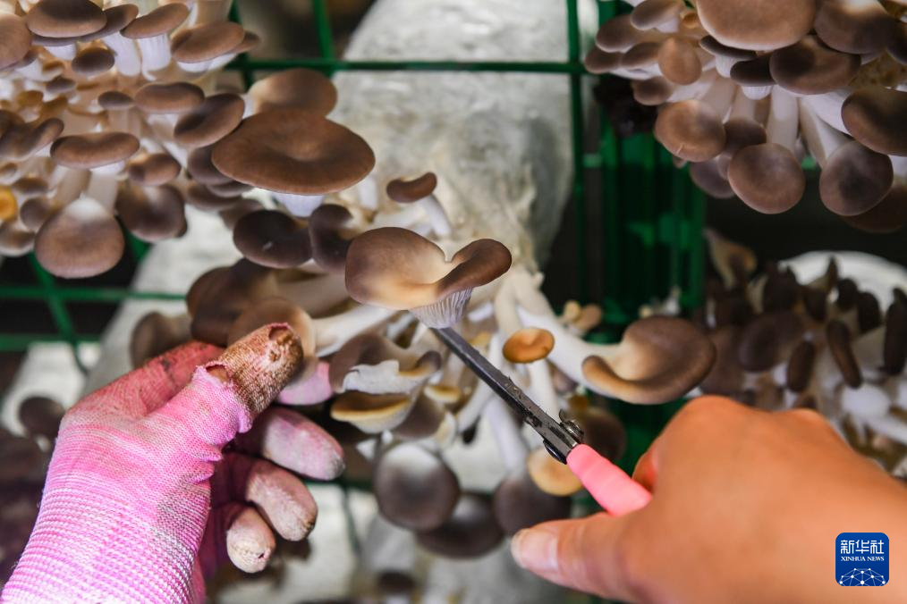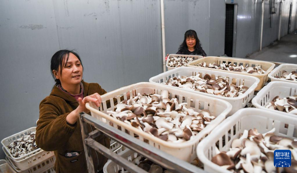 11月29日、何埂鎮豊楽村の食用キノコ栽培企業でヒラタケを収穫する従業員。(重慶=新華社記者/王全超)