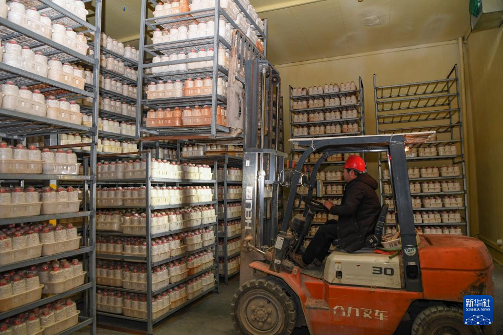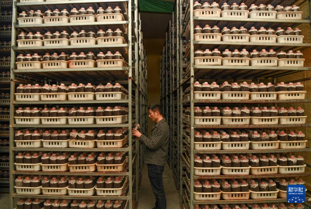 11月29日、何埂鎮豊楽村の食用キノコ栽培企業の培養室で菌糸の生育状況を確認する従業員。(重慶=新華社記者/王全超)