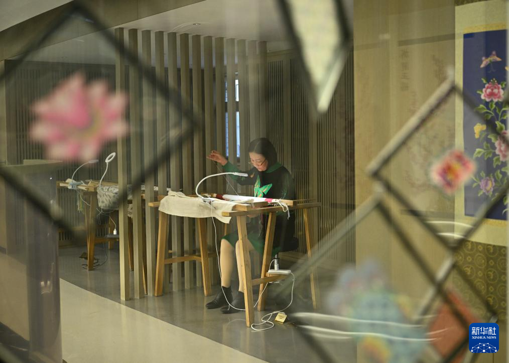 湖北省武漢市にある任煒漢繍工房で、作品を刺す任煒さん。(3月14日撮影、武漢=新華社記者/杜子璇)
