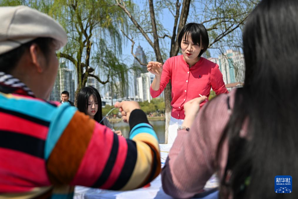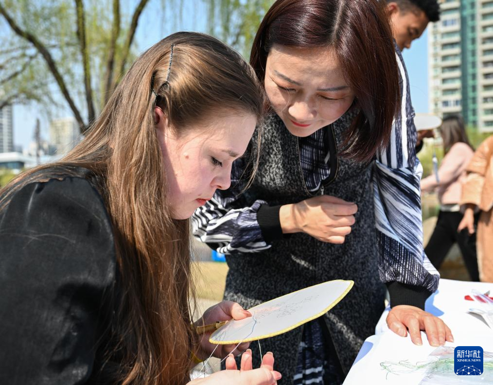 漢繍の愛好家に刺しゅう技術について説明する任煒さんの娘、王煒佳さん。(3月19日撮影、武漢=新華社記者/杜子璇)