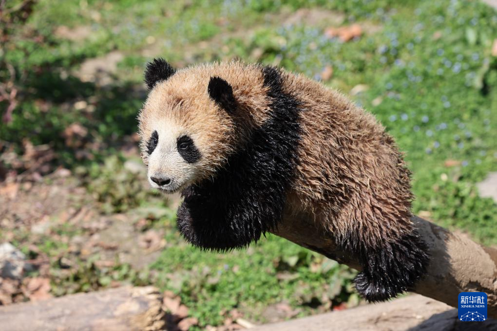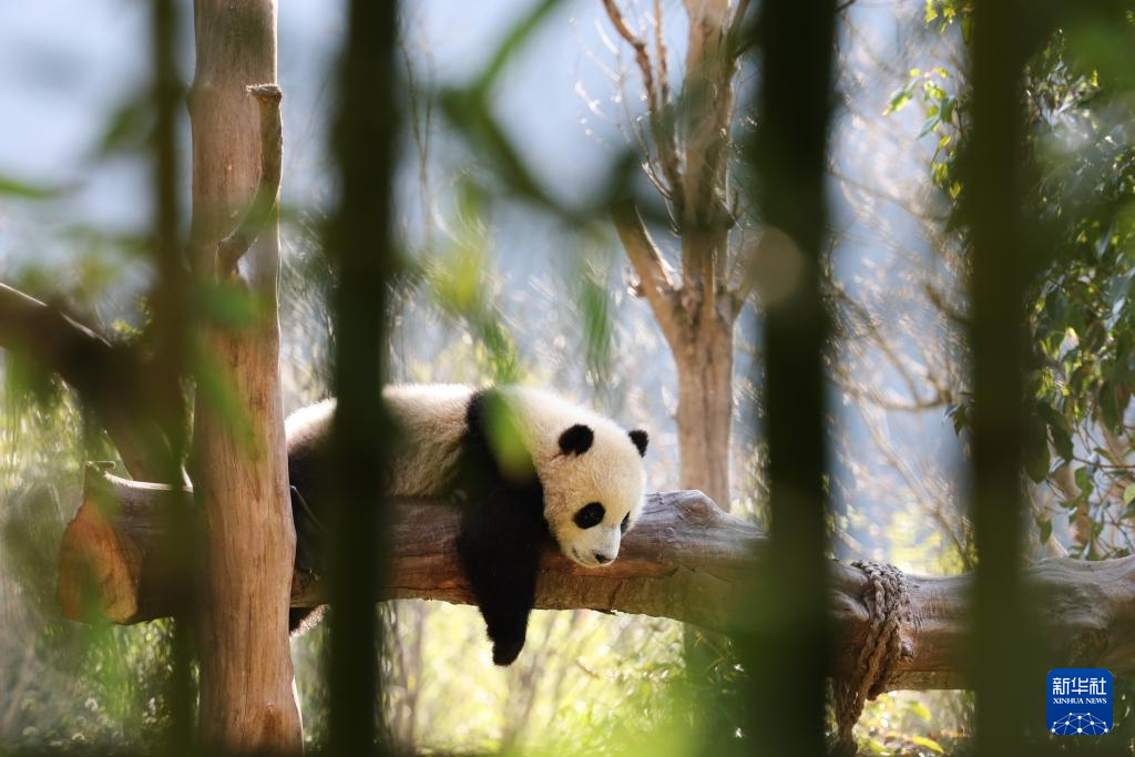 【新華社成都3月31日】中国四川省のジャイアントパンダ保護研究センター臥竜神樹坪基地では春の陽気の中、パンダが木の上や草地でのんびりとした姿を見せていた。pagebreak
