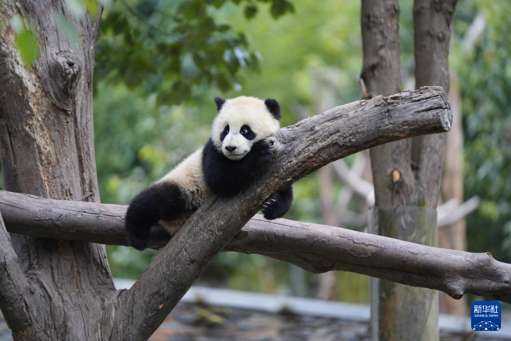 28日、木の上で休むパンダの子ども。(成都=新華社記者/辛夢晨)