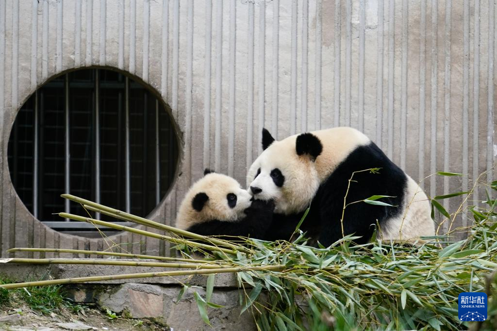 28日、「璨璨(ツァンツァン)」と子ども。(成都=新華社記者/胥氷潔)