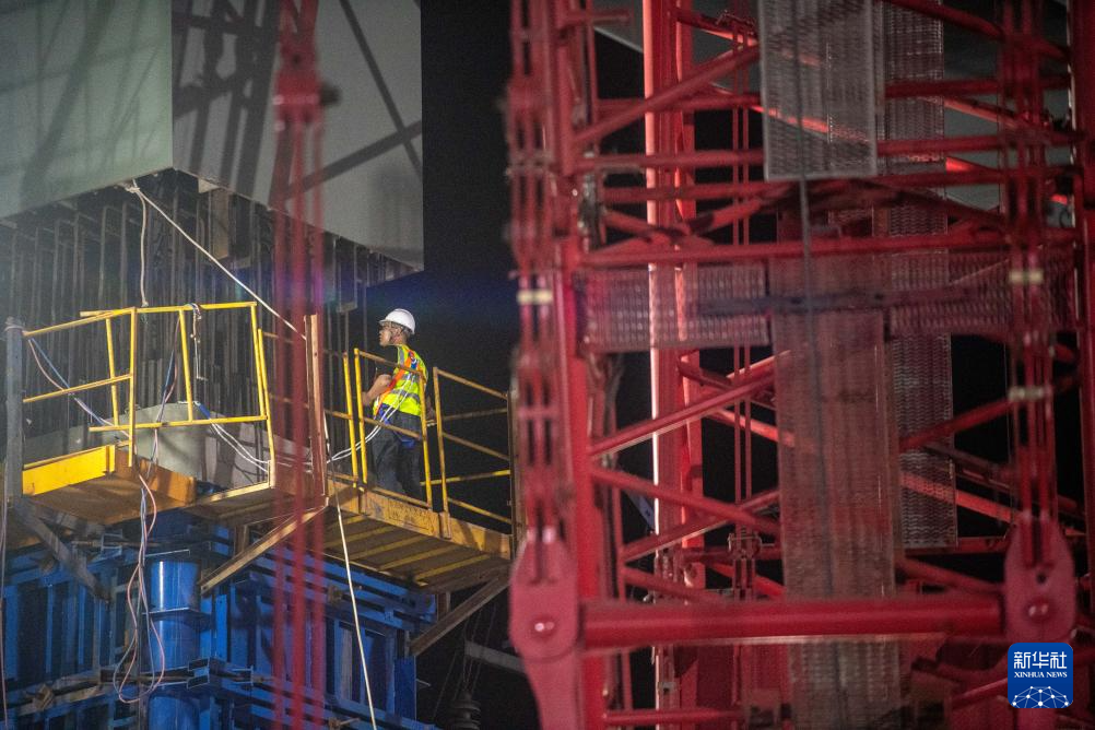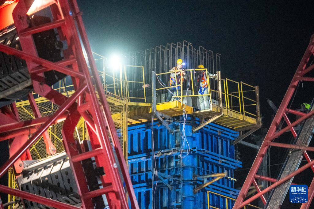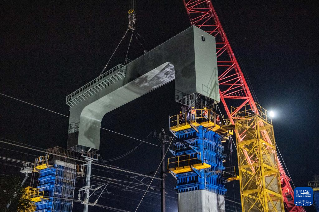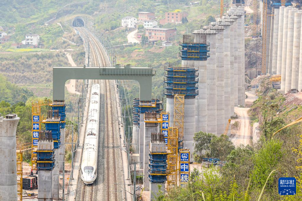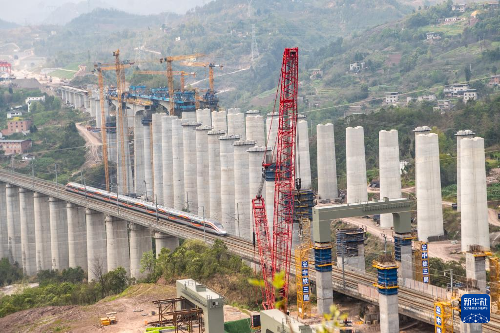 【新華社重慶3月31日】中国四川省の成都、達州両市と重慶市万州区の間で建設中の成達万高速鉄道は、重慶-万州都市間鉄道をまたぐ福寿特大橋の建設現場で27日、最初の鋼横梁の設置が完了した。