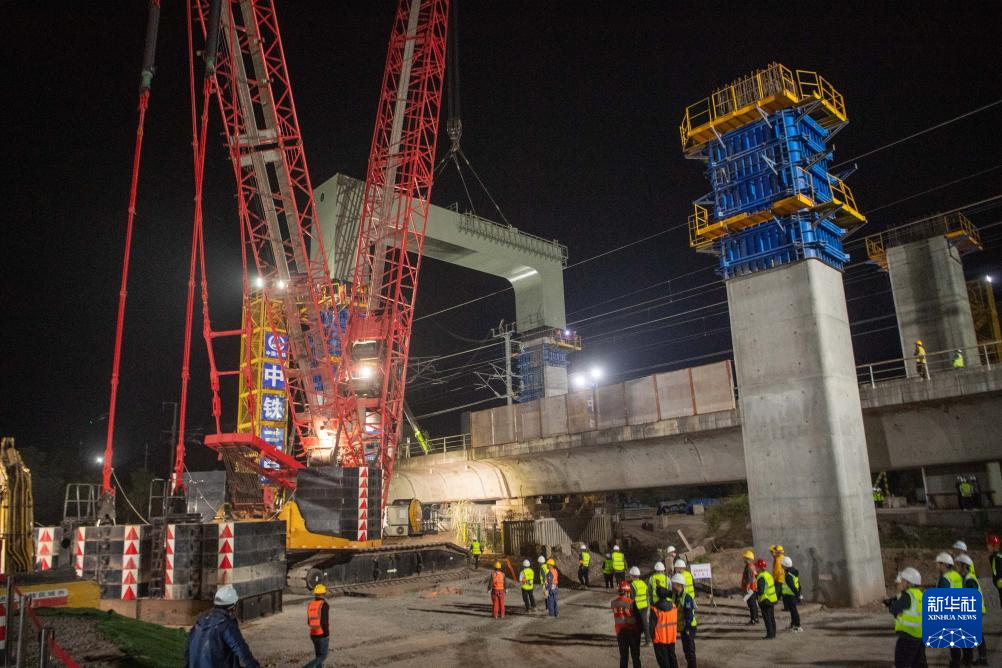 27日、成達万高速鉄道の建設現場で行われた鋼横梁の吊り上げ設置作業。(重慶=新華社記者/唐奕)pagebreak