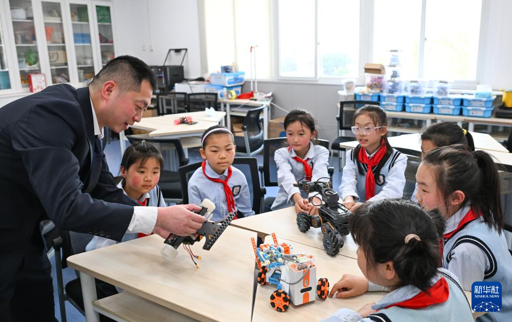 27日、重慶市江北区の新村同創国際小学校科学技術イノベーション部で児童に自動化設備の動作原理を説明する教員(左端)。(重慶=新華社記者/王全超)