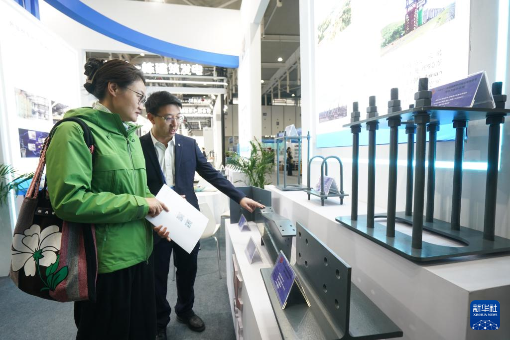 1日、建築用新素材を来場者に紹介する中鉄十一局集団第七工程の職員(右)。(南京=新華社記者/季春鵬)pagebreak
