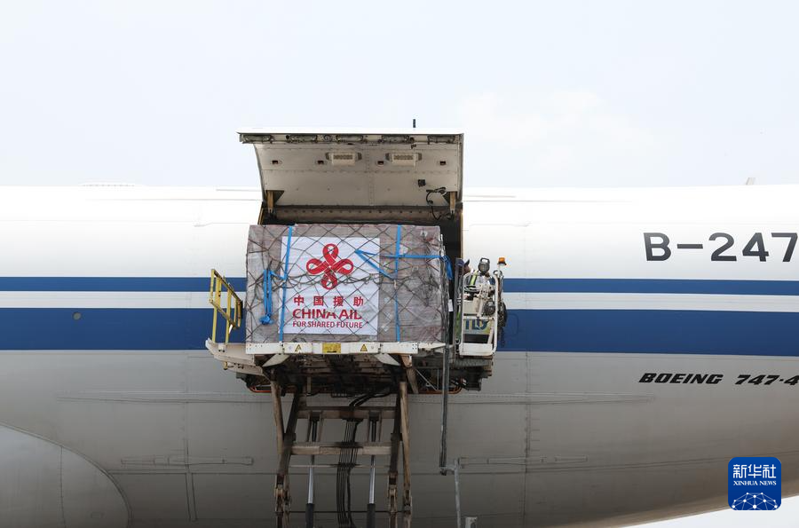 3日、救援物資を積み、ヤンゴン国際空港に到着した中国の貨物機。(ヤンゴン=新華社記者/賈浩成)