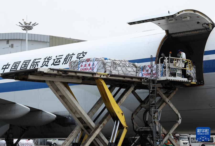 3日、ヤンゴン国際空港で貨物機から運び出される中国の救援物資。(ヤンゴン=新華社記者/賈浩成)