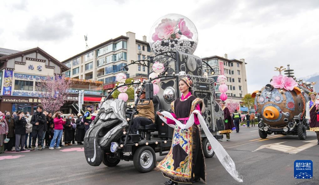 3日、第22回桃花観光文化フェスティバルで行われたフロートのパレード。(ニンティ=新華社記者/丁増尼達) pagebreak