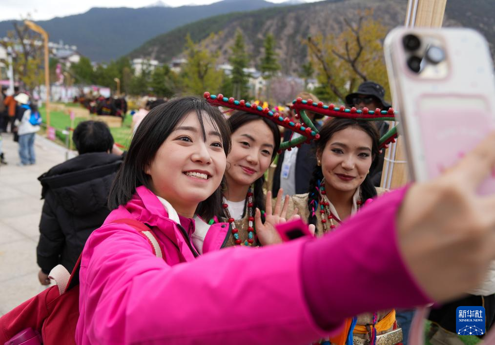 3日、第22回桃花観光文化フェスティバルでチベット族の伝統衣装に身を包んだ女性と自撮りする観光客。(ニンティ=新華社記者/晋美多吉)
