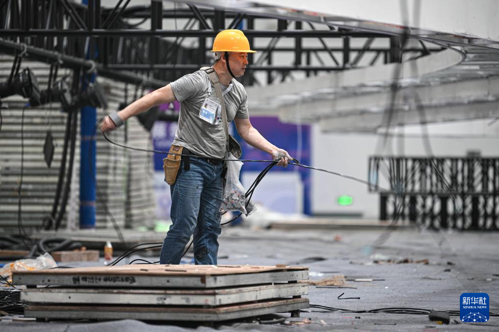 4日、海南国際コンベンション・エキシビションセンターで中国国際消費品博覧会のブースを設営する作業員。(海口=新華社記者/蒲暁旭)