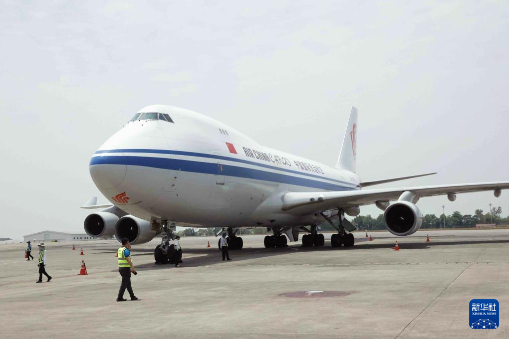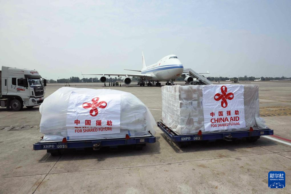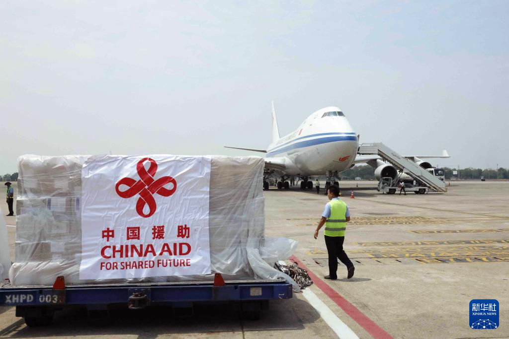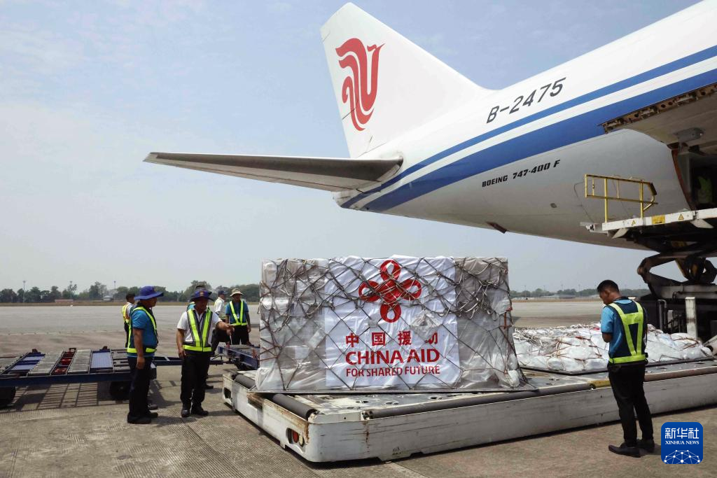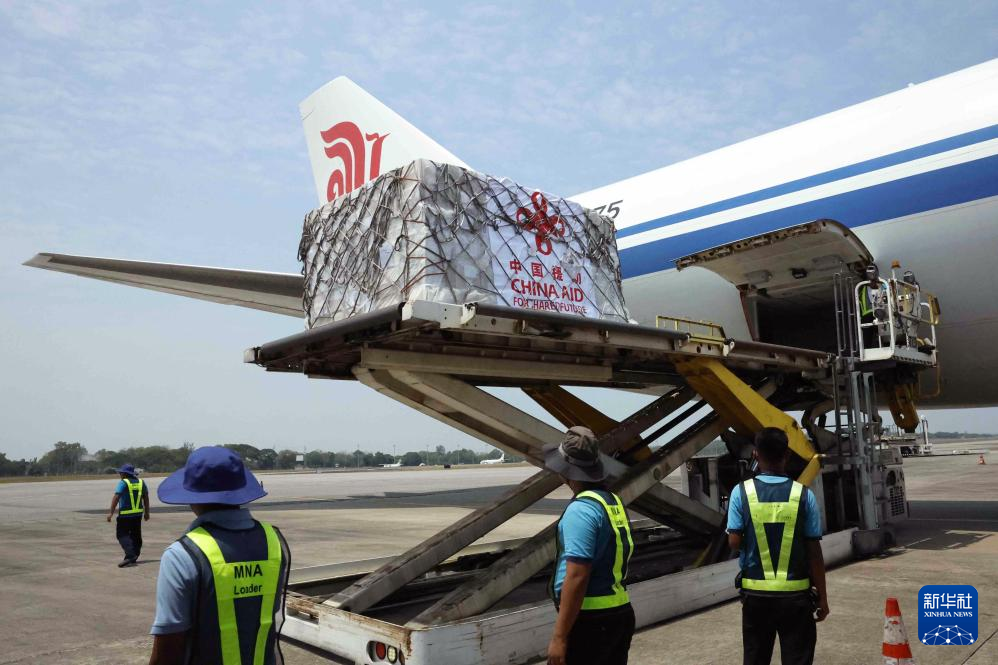 ミャンマーで発生した地震を受けて中国政府が提供する緊急救援物資の第3陣が5日、ヤンゴン国際空港に到着した。(ヤンゴン=新華社配信)