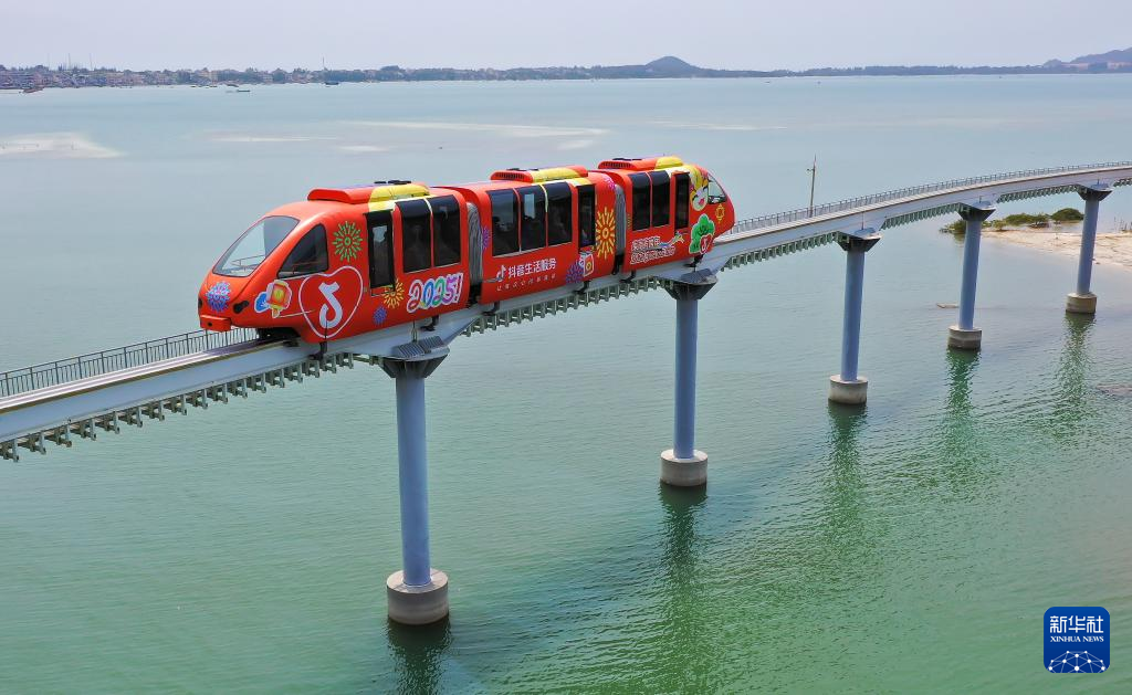 5日、海南オーシャンパラダイスリゾートを走る海上ミニ列車。(ドローンから、海口=新華社記者/郭程)pagebreak