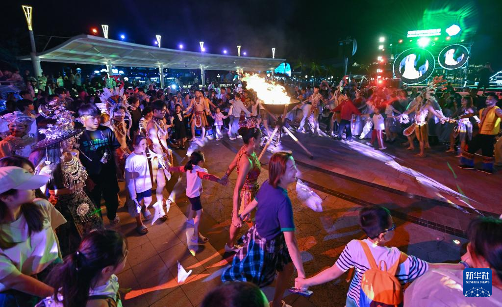 4日、海南オーシャンパラダイスリゾートで、かがり火の周りで踊る観光客とパフォーマー。(海口=新華社記者/郭程)