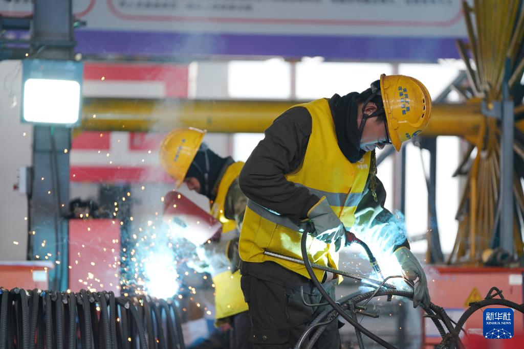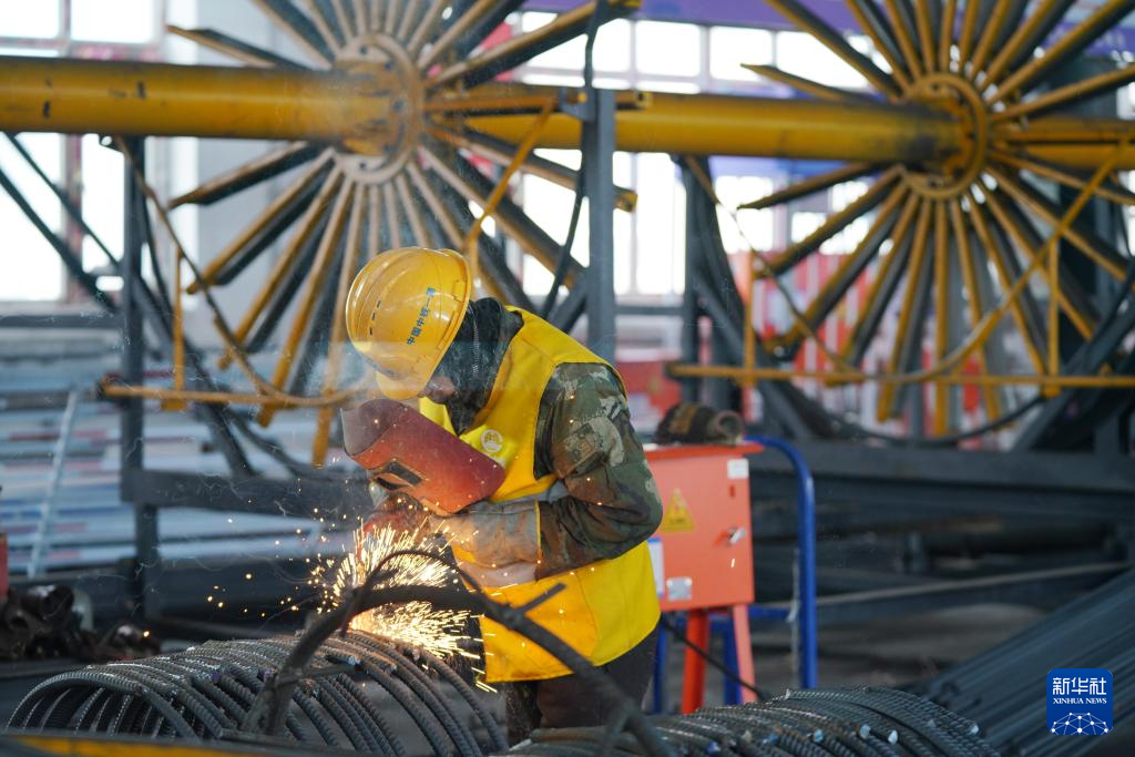 3月29日、黒竜江省の佳木斯-同江鉄道能力増強改修事業の鉄筋加工工場で溶接を行う作業員。(佳木斯=新華社記者/王松)