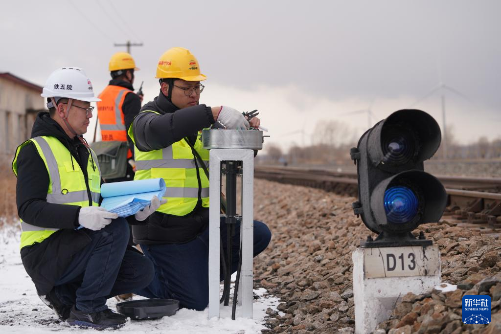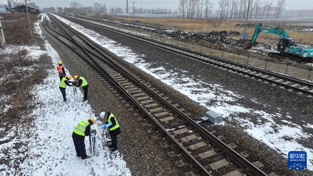 3月29日、黒竜江省の佳木斯-同江鉄道能力増強改修事業の佳富線四馬架駅で設備の設置を行う作業員。(佳木斯=新華社記者/王松)pagebreak