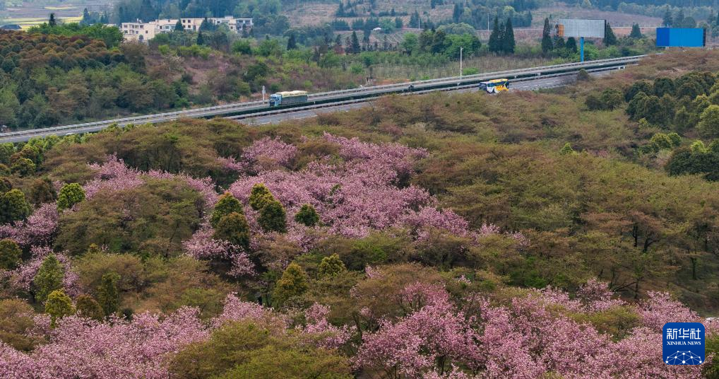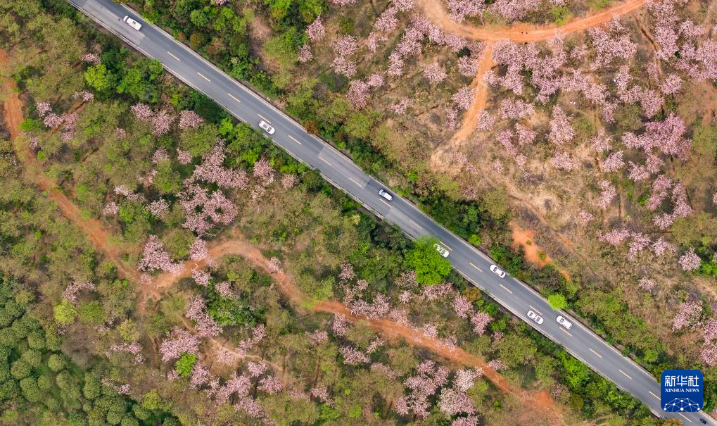 5日、清鎮市紅楓湖鎮右二村で、道路と引き立て合う花の海。(ドローンから、貴陽=新華社記者/陶亮)