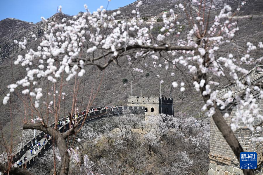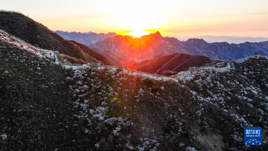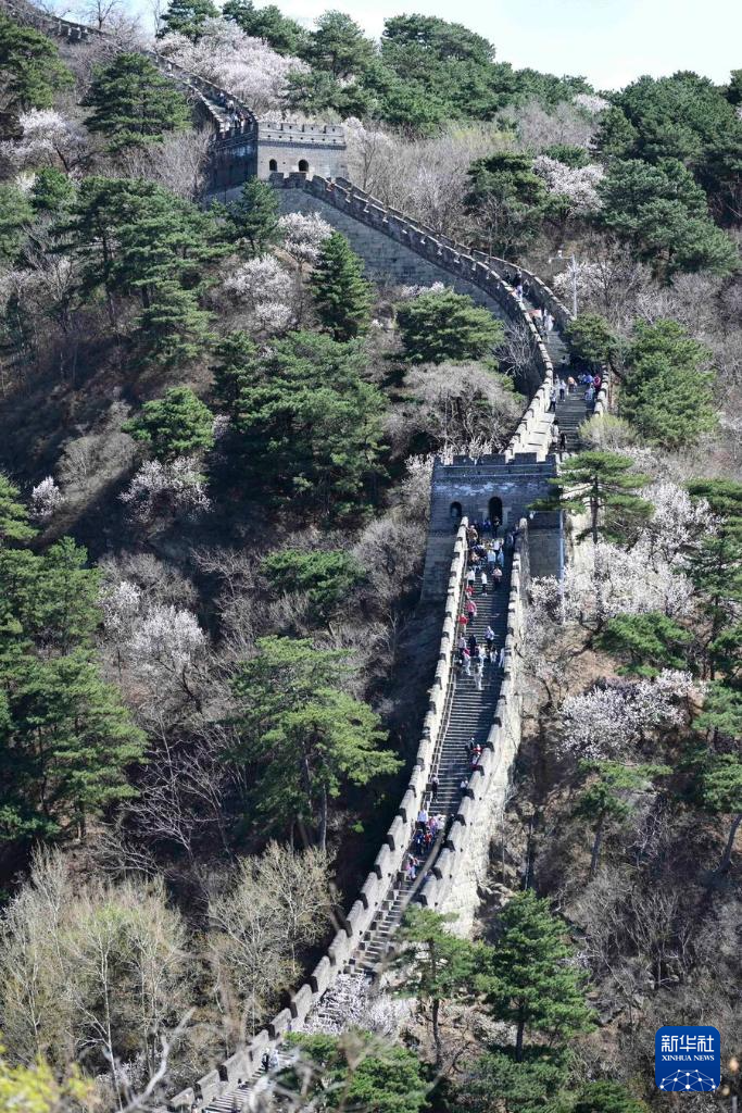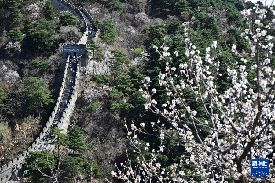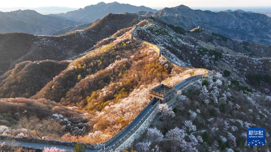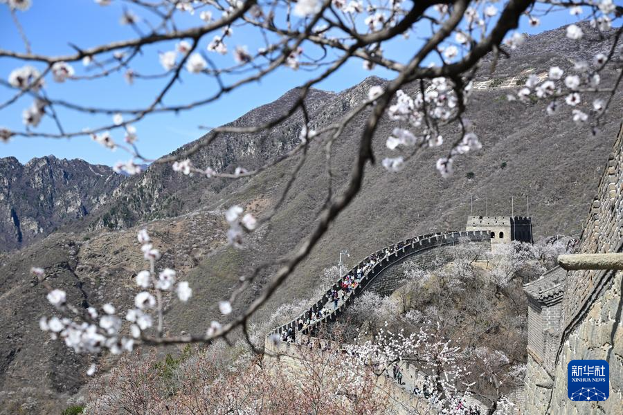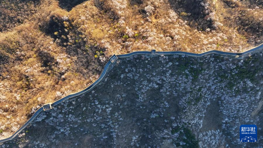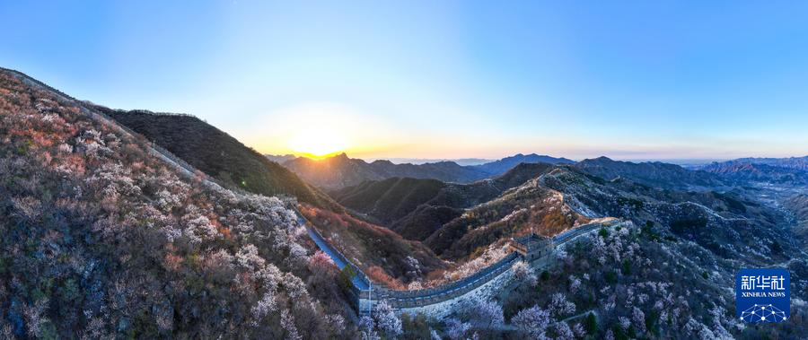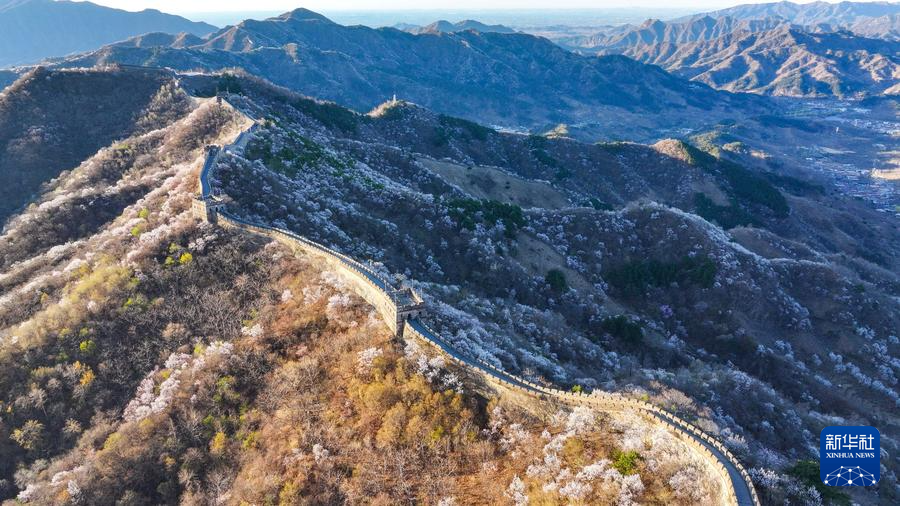 【新華社北京4月8日】中国北京市懐柔区の慕田峪長城から箭扣(せんこう)長城にかけて、春の花々が咲き乱れ、雄大な万里の長城に優しさを添えている。