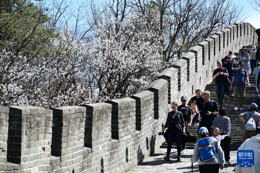 5日、花に彩られた慕田峪長城を歩く観光客。(北京=新華社記者/李賀)