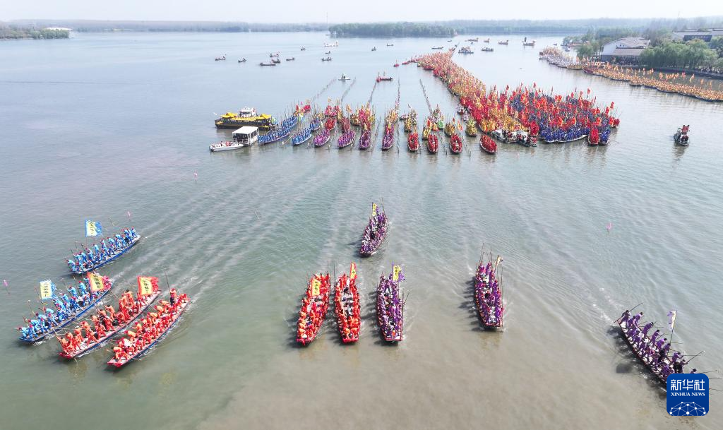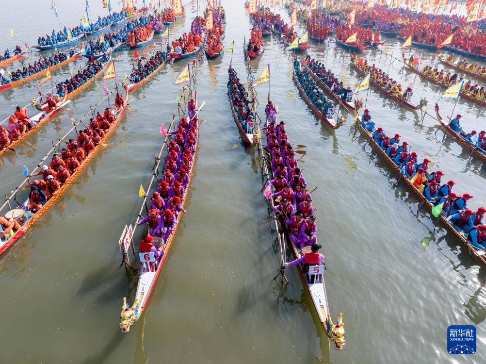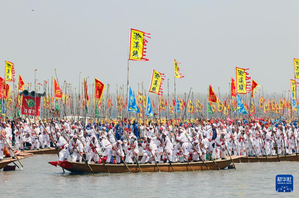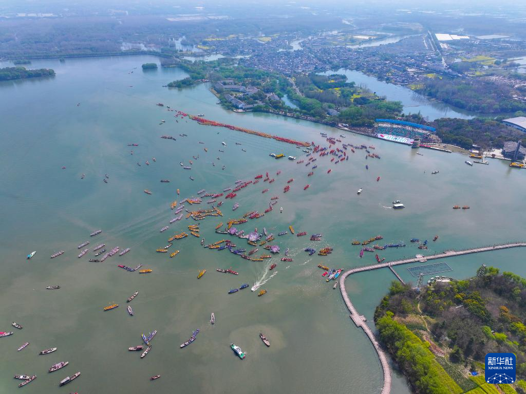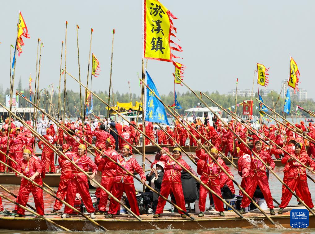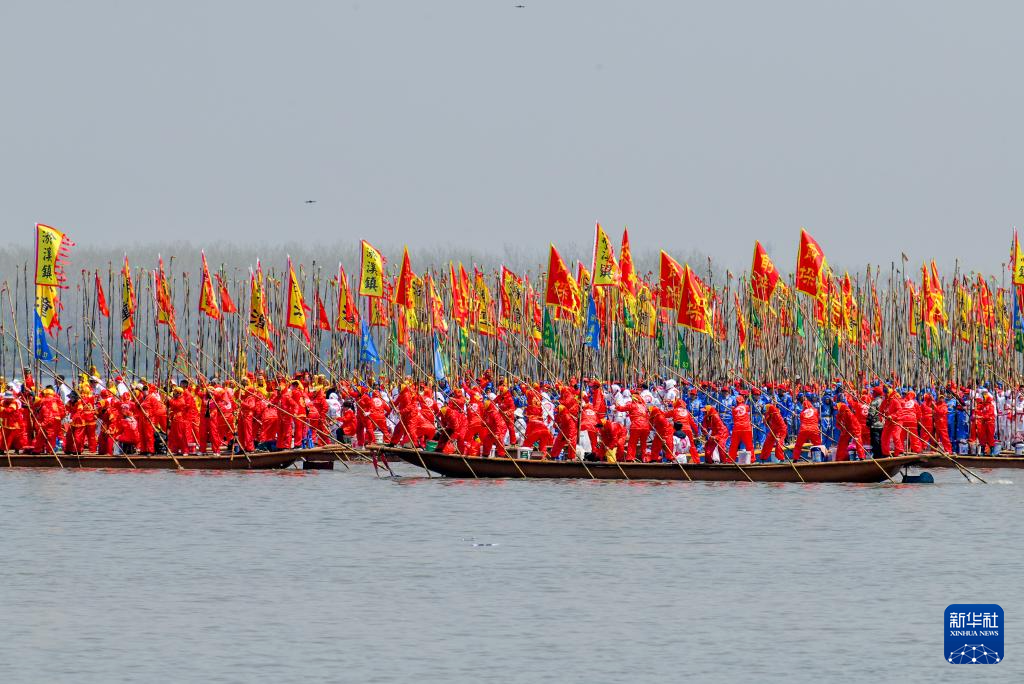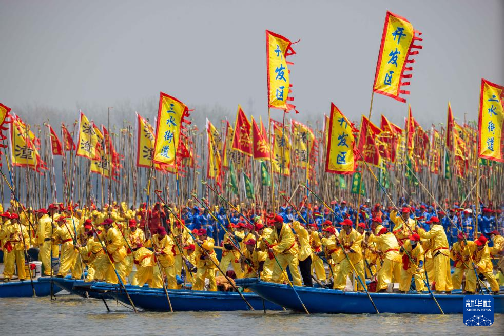 【新華社泰州4月8日】中国江蘇省泰州市姜堰区の溱湖(しんこ)国家湿地公園で6日、伝統のボートレース「泰州姜堰溱潼会船」が開催された。500隻を超えるさまざまな形状の舟と選手1万人以上が参加し、巧みな技を披露した。