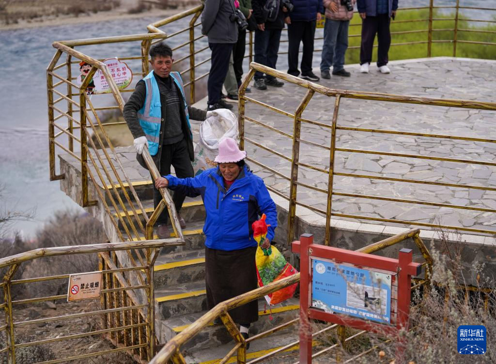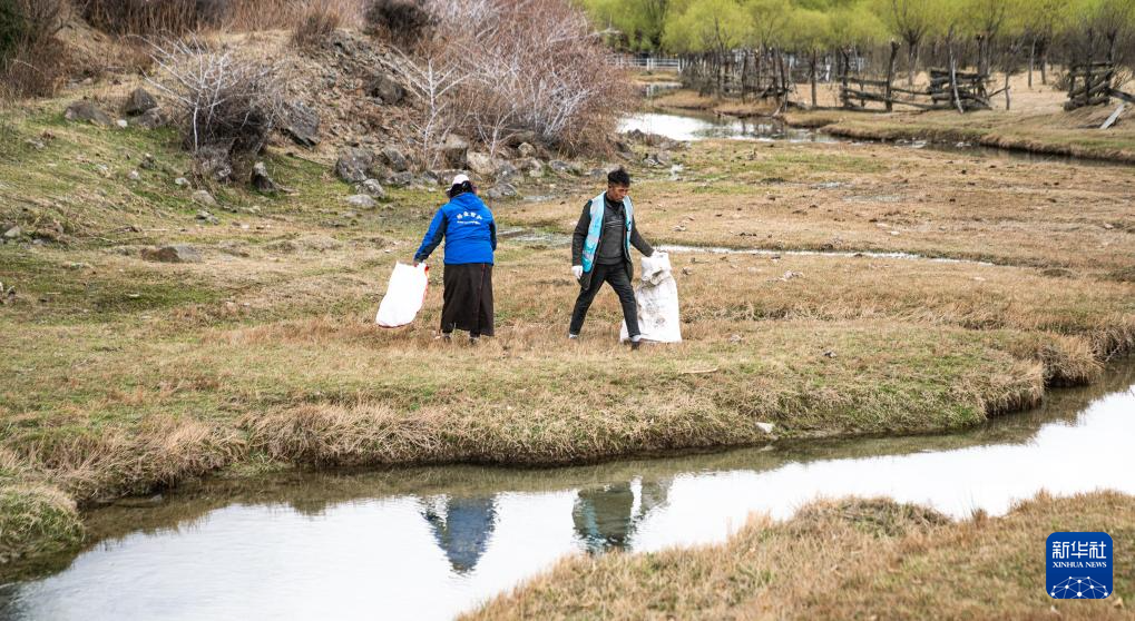 4日、巡回中に清掃を行う雅尼国家湿地公園の管理保護員。(ニンティ=新華社記者/丁増尼達) pagebreak