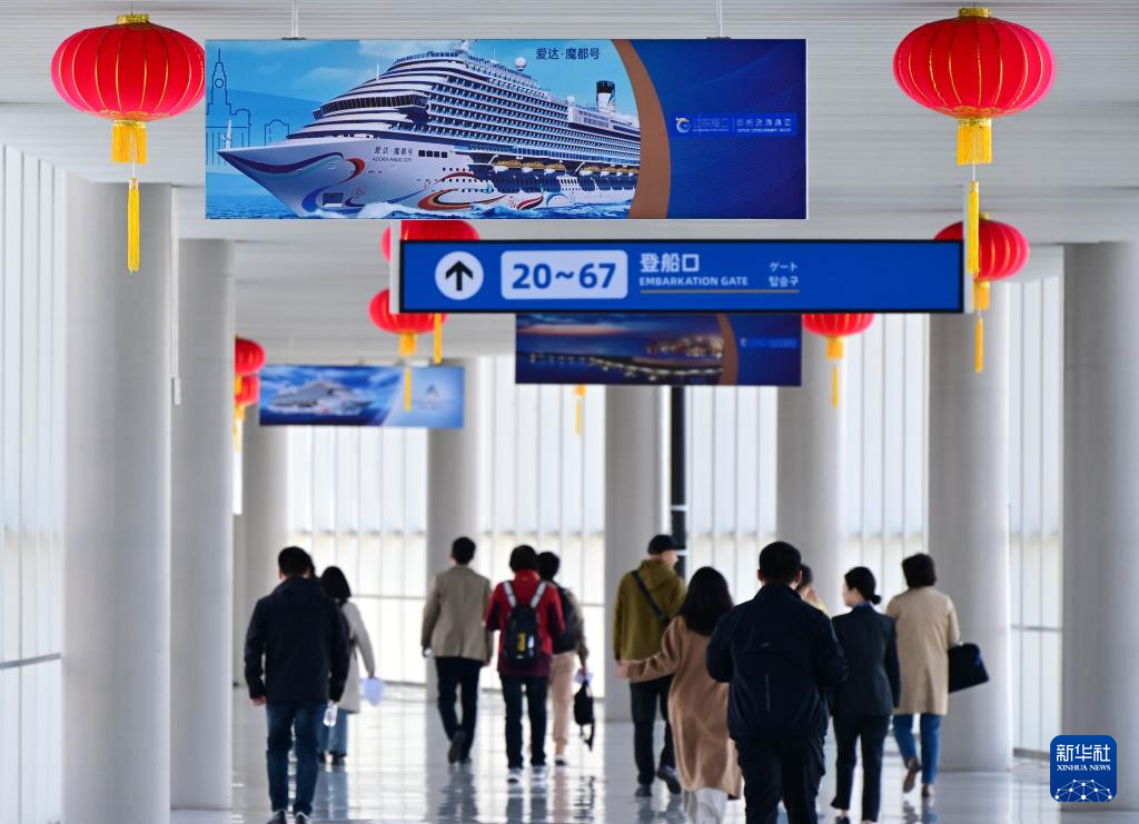 6日、青島クルーズ母港の待合ロビーで乗船を待つ人々。(青島=新華社記者/李紫恒)