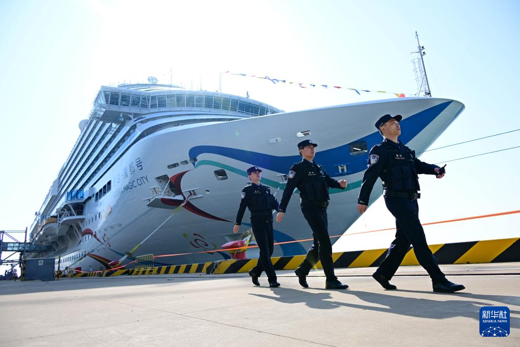6日、青島クルーズ母港ふ頭で、「愛達・魔都号」周辺を巡回する出入境検査所の警察官。(青島=新華社記者/李紫恒)pagebreak