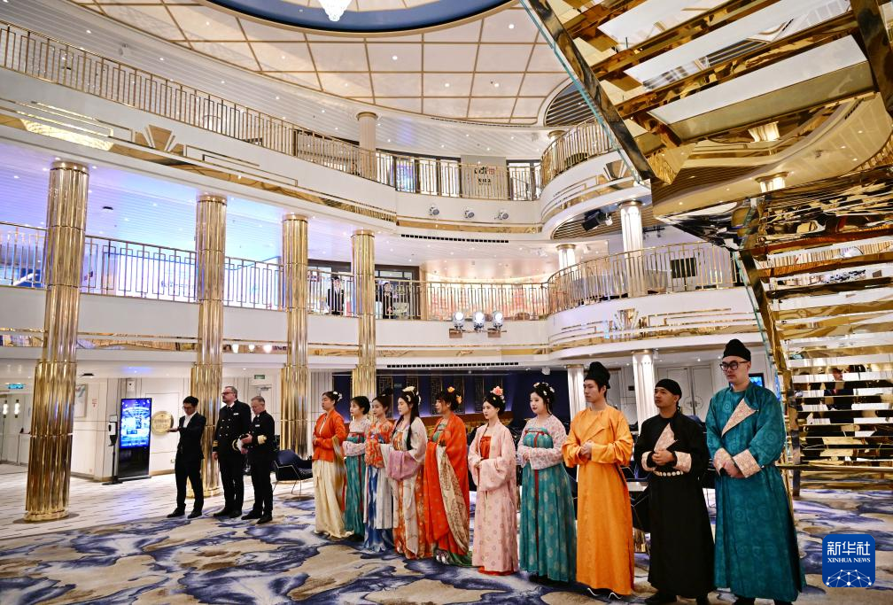 6日、「愛達・魔都号」のロビーで、乗客を出迎えるスタッフ。(青島=新華社記者/李紫恒)