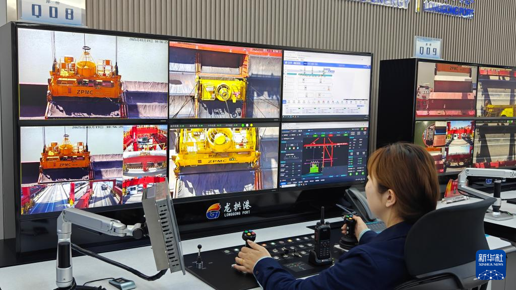 画面を見ながら遠隔操作を行うガントリークレーンのオペレーター。(3月19日撮影、済寧=新華社記者/蕭海川)