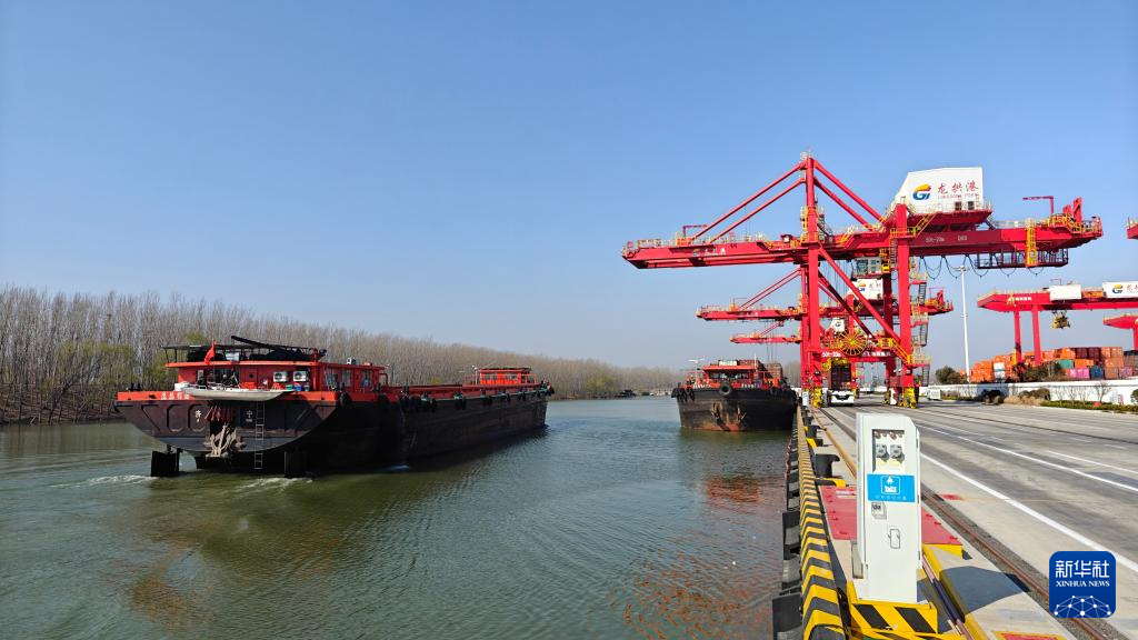 【新華社済南4月9日】中国山東省済寧市任城区にある竜拱港埠頭(ふとう)にこのほど、数隻の輸送船が停泊した。これらの船は浙江省杭州市と北京市を結ぶ京杭大運河の主航路から支流の竜拱河に入り、500メートル余り航行して到着した。