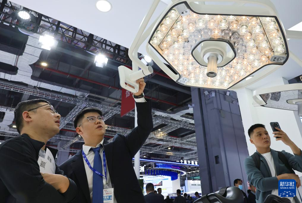 8日、手術室用照明装置を見学する来場者。(上海=新華社記者/方喆)pagebreak