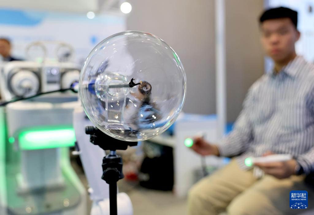 8日、展示会場で、スマートペンを使って、超小型の軟性内視鏡手術支援ロボットの操作実演を行うスタッフ。(上海=新華社記者/方喆)